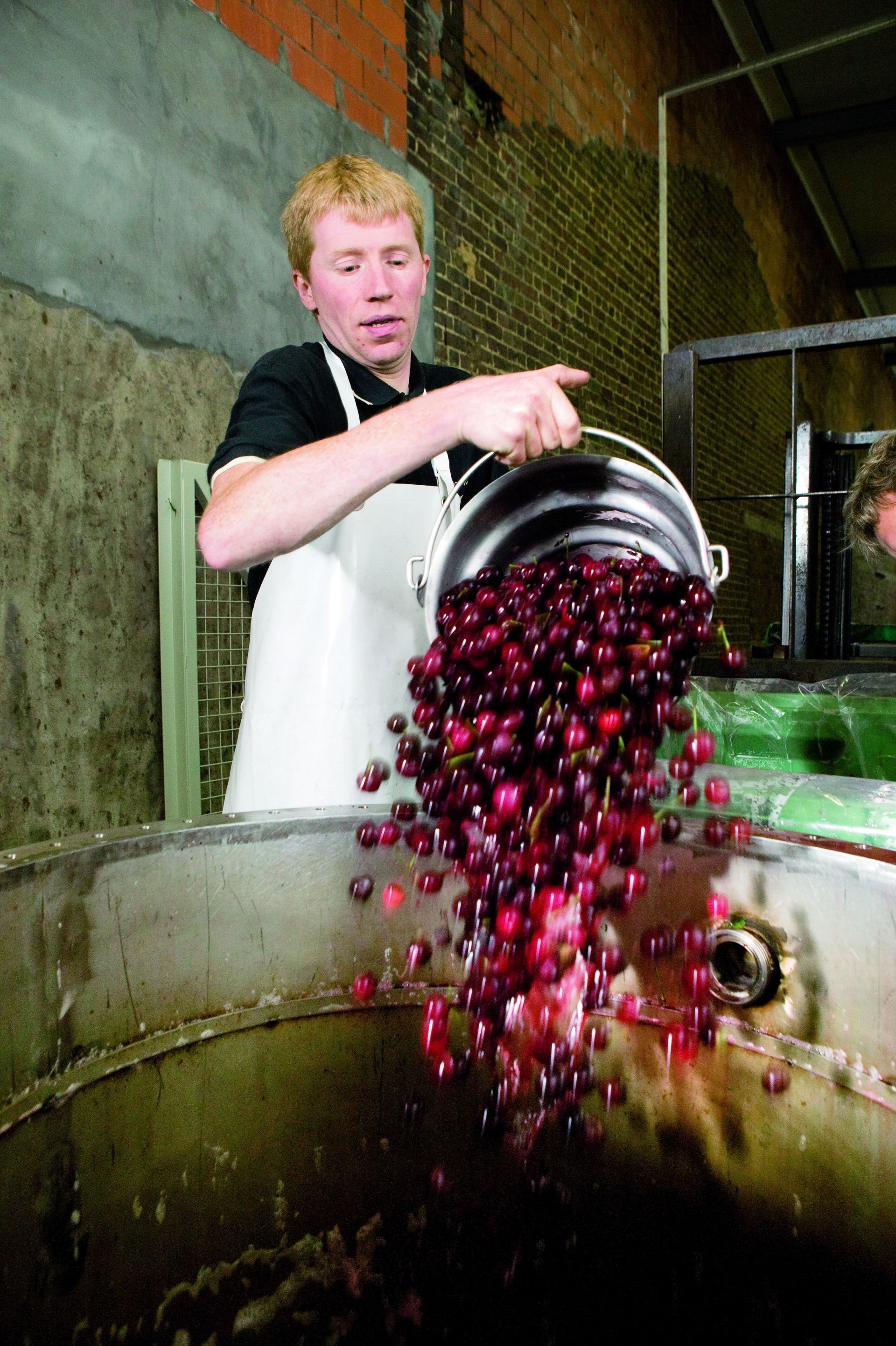 Wenn die Zeit der Kirschernte gekommen ist, fügt der Braumeister dem mindestens ein Jahr gereiftenBruin-Bier die Kirschfrüchte zu. Diese Sauerkirschen kommen aus eigenen Obstgärten oder aus Dänemark, wo eine besonders saftige Sorte gedeiht. Für ein 100 Liter Fass Kirschbier werden 13 kg frische Kirschen (d.h. die gesamte Kirschfrucht, nicht nur der Kirschsaft) benötigt. Das Bruin-Bier reift dann mit den Kirschen noch ca. 6-12 Monate in Eichenfässern, bis das Kirschbier (flämisch = Kriek) seine typisch rötliche Farbe und den fruchtigen Kirschgeschmack erlangt hat.